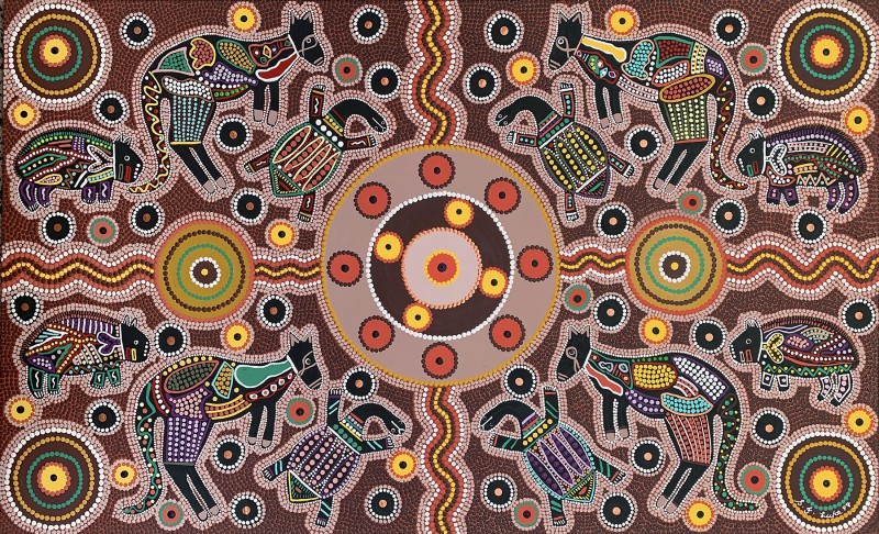 This painting "The Meeting Place" shows a series of meeting places. Those around the edge show meetings at a campfire with two people who have a shield and spear at their side. The lines to each campfire represent their journey. The central circle shows a group meeting with no spears or shields.